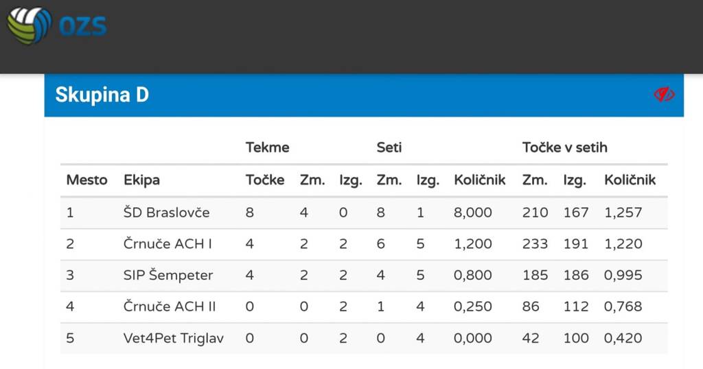 Črnuče ACH I: ŠD Braslovče 1:2 (25:20, 23:25, 13:15)